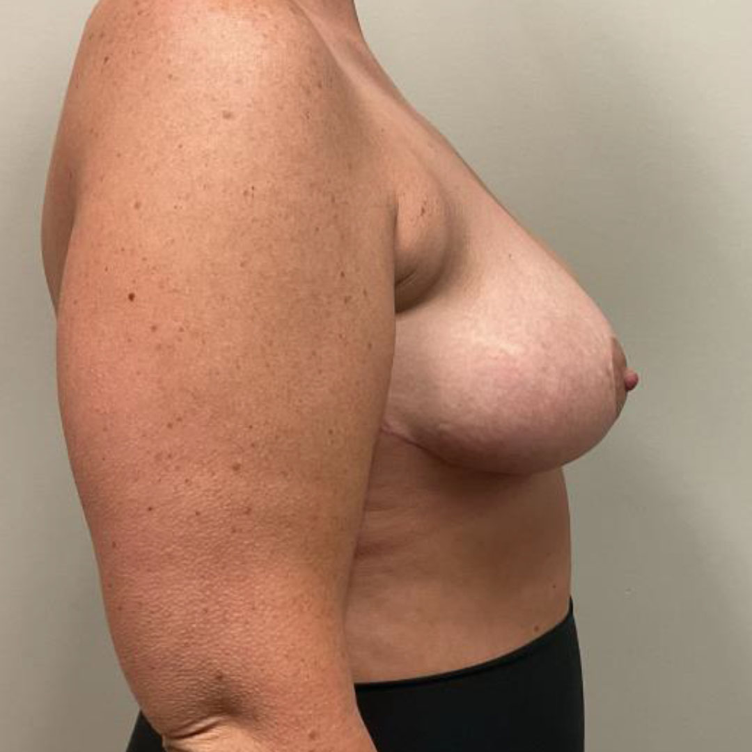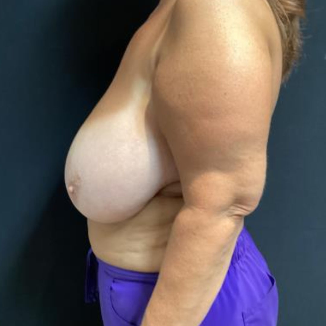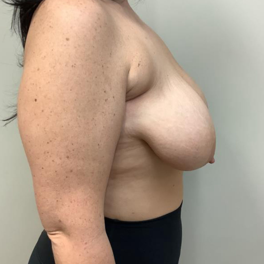Patient is one month post bilateral breast reduction. Patient was size G bra prior and suffered from severe back and neck pain. Patient is thrilled with her early results and pain relief.
